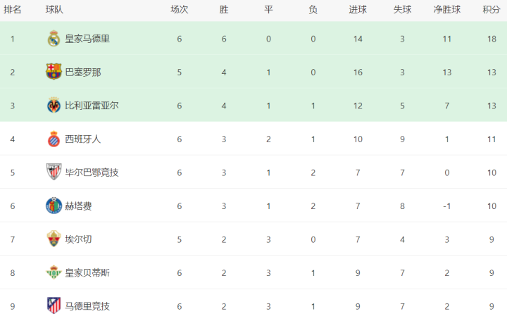 在积分榜上,皇马非常强势,6战全胜以18分排名榜首。巴萨13分紧随其后。巴萨落后5分,但比皇马少踢1场。比利亚雷亚尔也是13分,排名第3。第4的是西班牙人,拿到11分。毕尔巴鄂竞技和赫塔费都是10个积分。而马竞赢下比赛之后,战绩是2胜3平1负,总积分9分,排名第9!马竞已经掉队,要想冲击冠军很难很难。