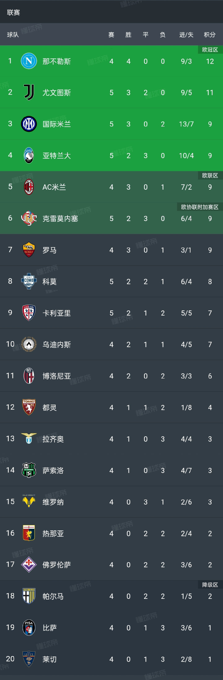 那不勒斯少赛一场,四连胜,积12分领跑。