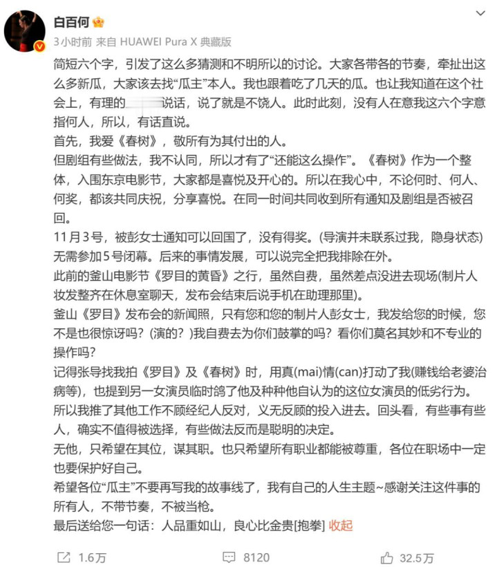 2025-11-19白百何发长文正面开撕, 自曝遭《春树》主创排挤