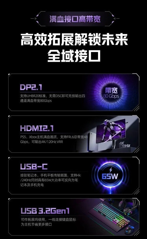 在电竞和多任务需求日益增长的当下,显示器的多平台适配能力变得尤为重要。AGP327UZD配备USB3.2Gen1、USB-C(支持65W反向供电)、DisplayPort2.1、HDMI2.1和音频输出等多种主流接口,无论连接PC、主机还是移动设备,都能实现即插即用。配合LightFX音乐律动氛围灯与四向可调支架,兼顾功能与美学,满足高效互联和沉浸电竞的多元需求。