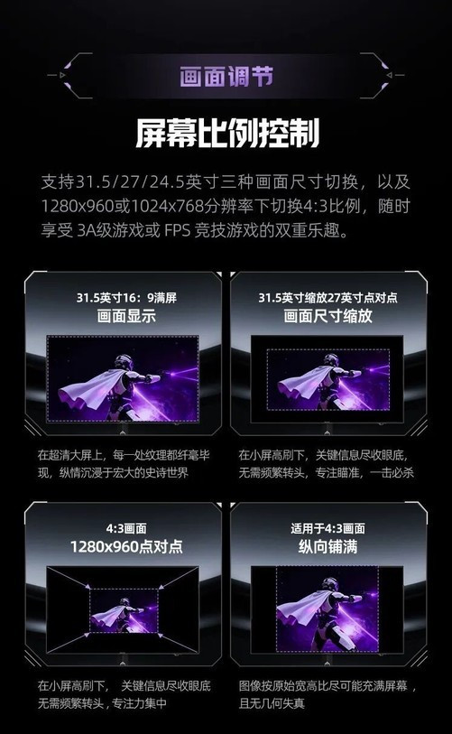 针对多任务与专业竞技需求,AGP327UZD支持PBP双画面和PIP画中画功能,可实现多源信号同步显示,让用户能够边游戏边查资料或处理工作任务。KVM一键切换功能让双设备共用一套键鼠,办公与娱乐切换自如,无需频繁插拔,极大提升工作与游戏效率。同时,支持31.5/27/24.5英寸三种画面尺寸切换,以及1280x960或1024x768分辨率下切换4:3比例,随时享受3A级游戏或FPS竞技游戏的双重乐趣。