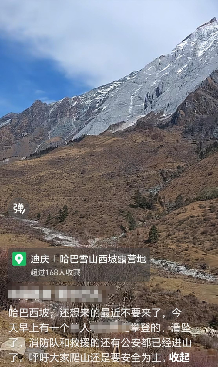 当地有关部门工作人员证实,确实有人在哈巴雪山滑坠失联,目前已在搜救。