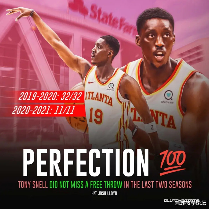 斯内尔并非一无是处,生涯最后三个赛季,罚球命中率都是100%。2020-21赛季,他在老鹰场均5.3分2.4篮板1.3助攻,三项命中率:51.5%,56.9%,100%。斯内尔成为NBA首位单赛季命中率50+50+100的球员(运动战至少出手100次)。