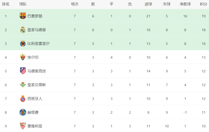 西甲榜首易主。巴萨6胜1平保持不败,拿到19分,超越皇马登上了榜首位置。皇马6胜1负,拿到18分,以1分的劣势排名第2。第3的是比利亚雷亚尔,拿到了16分。大黑马埃尔切7场不败,3胜4平的战绩极其出色,拿到13分,排名第4。要知道埃尔切的总身价只有6495万欧元,却取得如此出色的战绩。马竞以12分排名第5。皇家贝蒂斯和西班牙人也都是12个积分。
