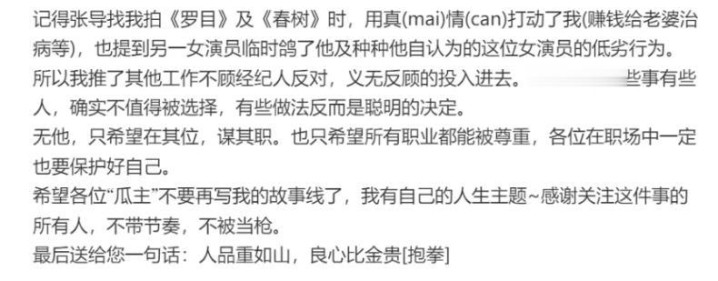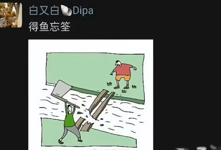 她发文中提到导演曾各种卖惨,求她出演《春树》,利用完她后又冷落她,恰恰应了她朋友圈发的那个四字成语“得鱼忘筌”。
