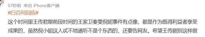 网友却不明白他有什么资格发牢骚,觉得无论站在哪个角度,王传君都是获利最大的一方,这段话借给白百何发才合适,于是评论区发生了大翻车。