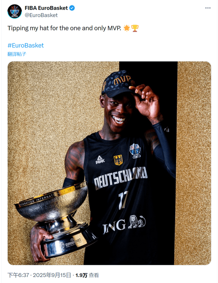 北京时间9月16日,男篮欧洲杯于昨天落下帷幕。德国队在决赛中击败土耳其队夺得冠军,施罗德发挥优异当选为赛事MVP。在今天早些时候,施罗德更新社交媒体庆祝夺冠,FIBA官方也向施罗德表达了敬意。