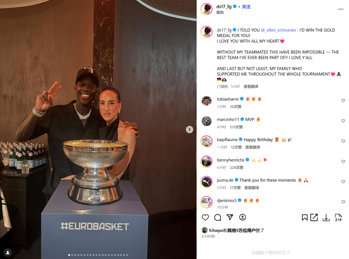施罗德晒照庆祝欧洲杯夺冠! 深情示爱妻子 FIBA官方赞其独一无二