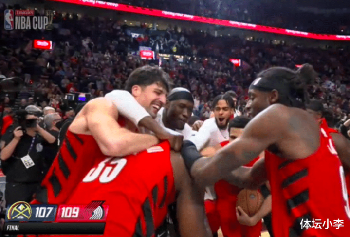 随着约基奇抛投不中,比赛就此结束,开拓者全队在场上开心的庆祝,全都围着格兰特,他是球队取胜功臣。替补席上的球员也纷纷来到球场当中,接着围在一起开心的庆祝着(里斯就冲上来与队友搂在一起),能够在主场击败强大对手掘金还是挺让人振奋的,同时在小组出线的机会上占据一个主动。